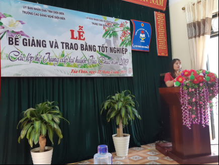 Đ/c Bùi Thị Thu Hiền – Phó Hiệu trưởng trưởng cao đẳng Nghề tỉnh Điện Biên Phát biểu tại buổi Lễ đồng chí Bùi Thị Thu Hiền –Phó hiệu trưởng trường Cao đẳng Nghề tỉnh Điện Biên gửi lời chúc mừng đến các học viên được công nhận tôt nghiệp, chúc các học viên bằng những kiến thức đã học tại trường sẽ áp dụng hiệu quả vào thực tiễn góp phần xây dựng quê hương. Thay mặt cho Trường Cao đẳng Nghề tỉnh Điện Biên đồng chí Bùi Thị Thu Hiền mong muốn trong thời gian tới tiếp tục hợp tác với Trung tâm GDNN – GDTX huyện Tủa Chùa để mở thêm các lớp tiếp theo để giúp cho các học viên sau khi ra trường bằng những kiến thức đã học có thể giúp cải thiện cuộc sống gia đình và vươn lên làm giàu.